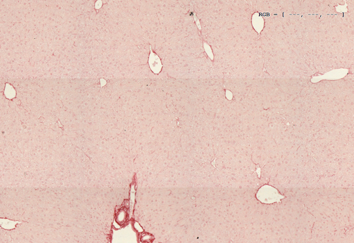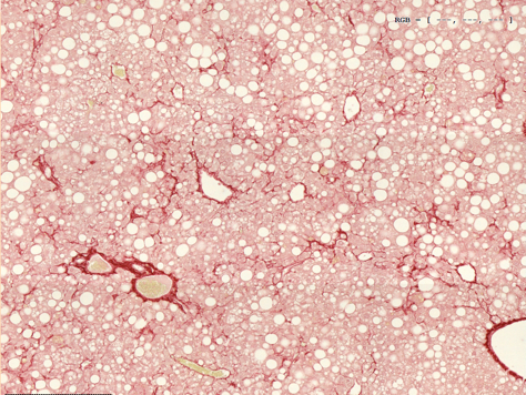 Sometimes humans having obesity and fatty liver develop fibrosis, which is a wound healing process that has gone awry and results in detrimental scarring of organs and their dysfunction. To measure fibrosis levels in our mice, we perform Sirius red staining of liver sections depicted in the picture below. On the left-hand side is a non-fibrotic liver from lean mice and on the right side is a fibrotic liver of obese mice.
