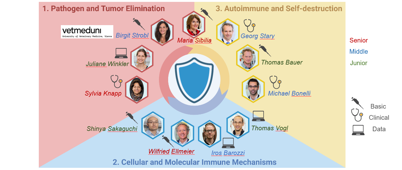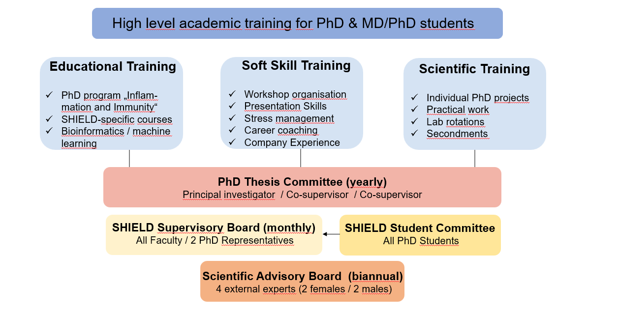 The immune system protects our body from external and internal threats. The elimination of these threats or a misdirected attack on the body's own structures inevitably leads to tissue damage, which can have a negative impact on our health. In our new Ph.D. program SHIELD, we are dedicated to finding ways to protect tissue integrity because we know how many people are affected by autoimmune diseases, infections and cancer. Our new Ph.D. program focuses on interdisciplinary projects that address this topic from different perspectives. Our research will seamlessly combine basic and clinical research methods with data science. Each of the eleven PI brings a wealth of expertise and passion to their respective interdisciplinary projects, igniting a collective quest for knowledge and innovation in this highly specialized field. The Faculty Board brings together scientists from diverse backgrounds, ranging from pathogenesis and tumor elimination to autoimmunity and self-destruction to cellular and molecular mechanisms. Clinical, basic and data research are used in combination, enabling the SHIELD program to promise an unparalleled research and Ph.D. experience.