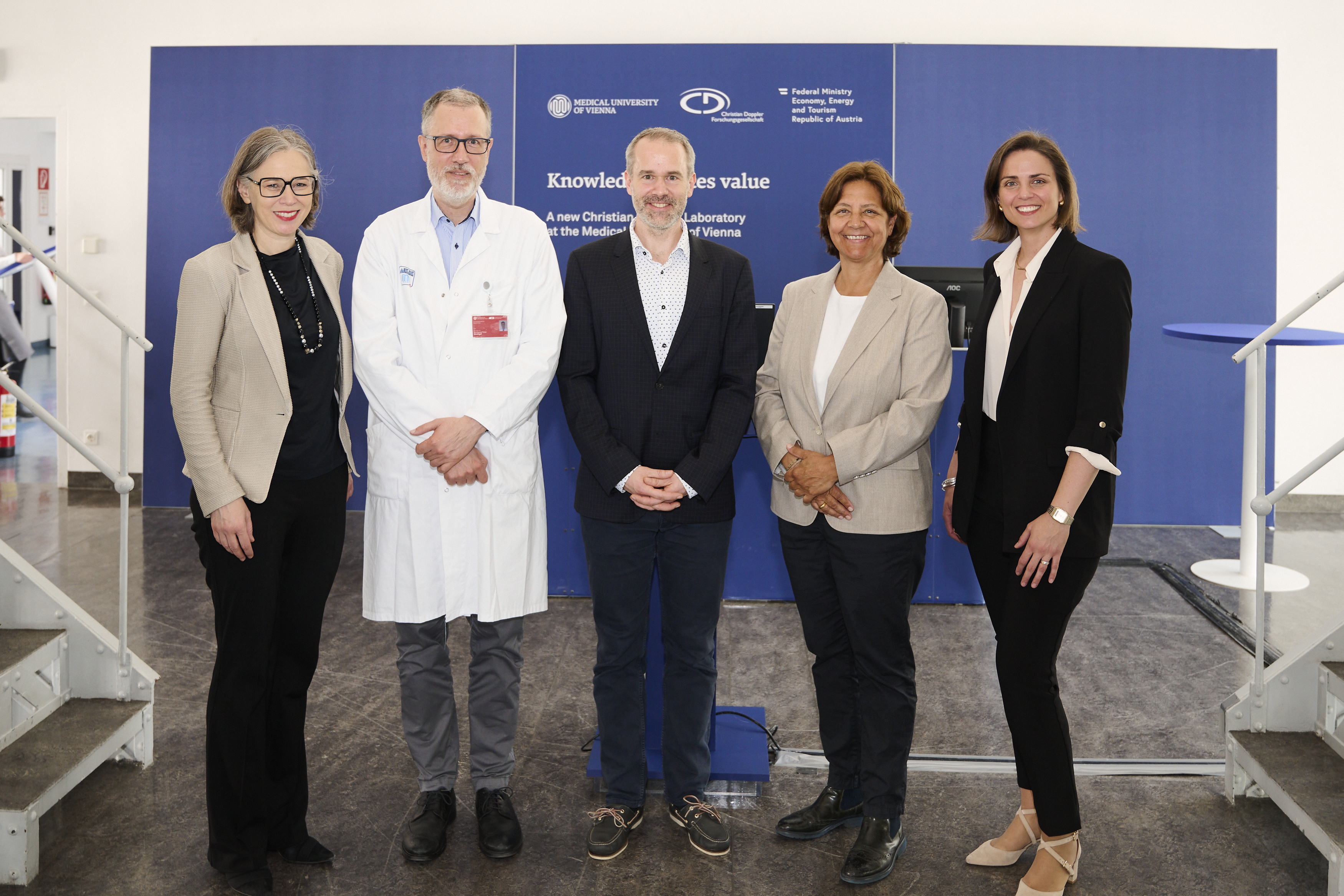 From left to right: Michaela Fritz (MedUni Vienna), Wolfgang Peter Weninger (MedUni Vienna), Georg Stary (MedUni Vienna), Sylvia Knapp (MedUni Vienna, Christian Doppler Research Association), Sara Leitao (Johnson & Johnson Innovative Medicine Austria).