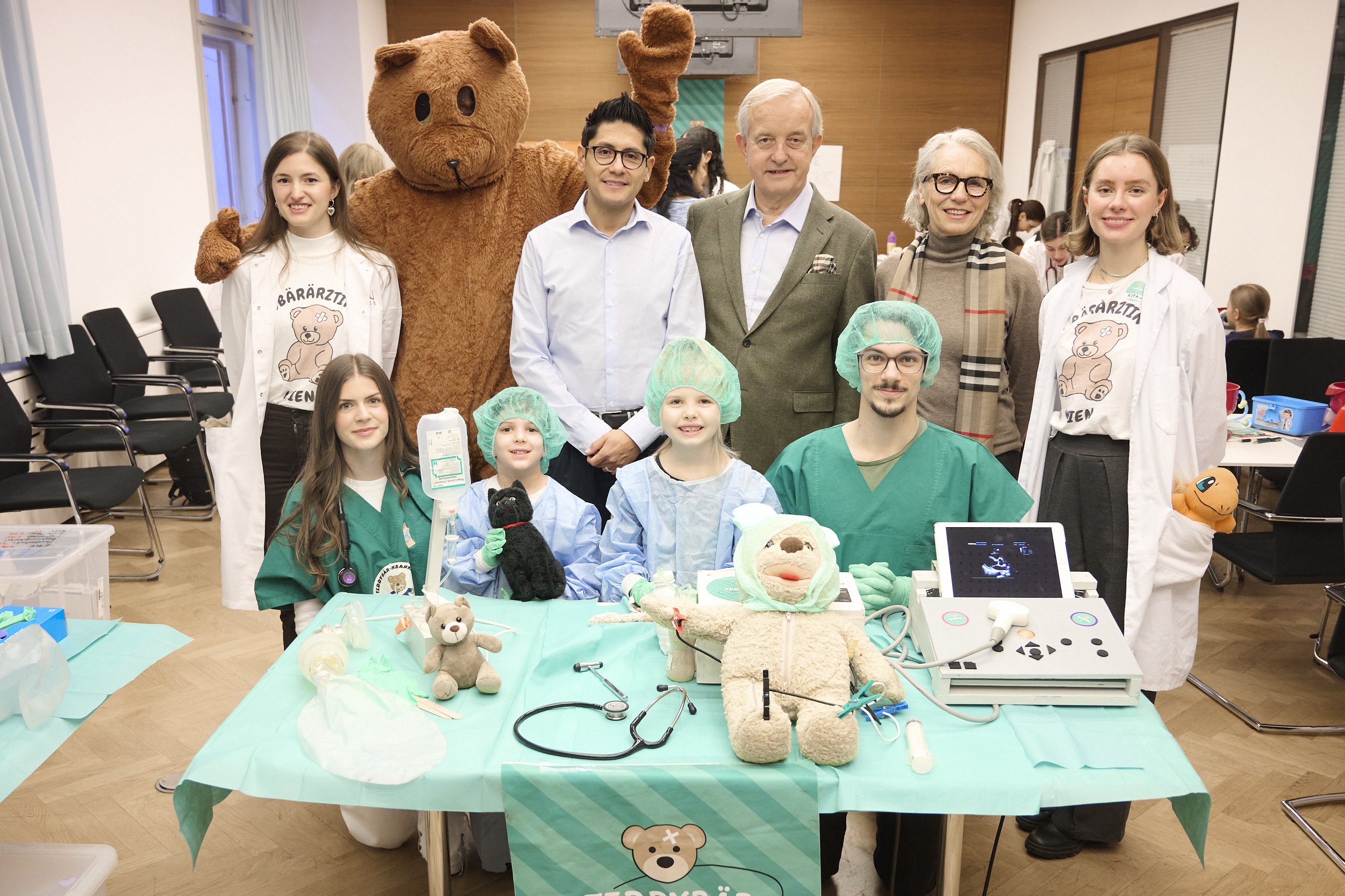 (Vienna, 02 December 2025) Hundreds of children brought their favourite teddy bears, cuddly toys and dolls to the Teddy Bear Hospital in Vienna today, an initiative in collaboration with MedUni Vienna, the Austrian Students' Association (AMSA), the Vienna Medical Association and the Academic Association of Austrian Pharmacists. In the lovingly designed outpatient clinics, the cuddly toys were examined, treated and even operated on by the young assistant doctors. Johannes Steinhart, President of the Vienna Medical Association, and Anita Holzinger, Director of the Dentistry Curriculum at MedUni Vienna, also provided active support with X-ray examinations and operations.