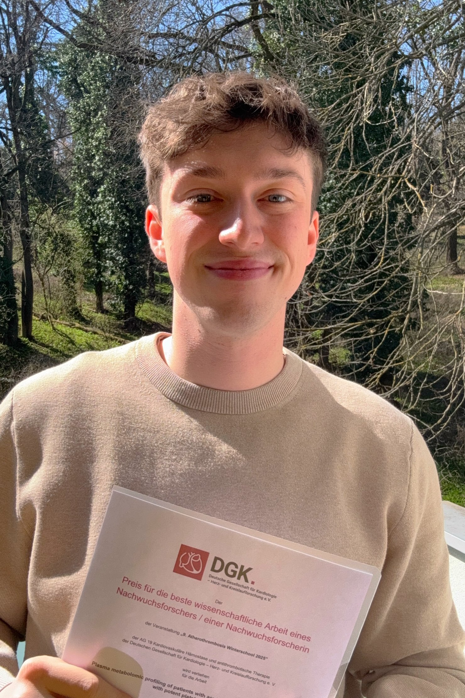 (Vienna, 26 March 2025) Jovan Rogozarski, PhD student at MedUni Vienna, was awarded the Young Researcher Prize at the 9th Atherothrombosis Winter School of the German Society of Cardiology (DGK) for the poster presentation on his thesis.