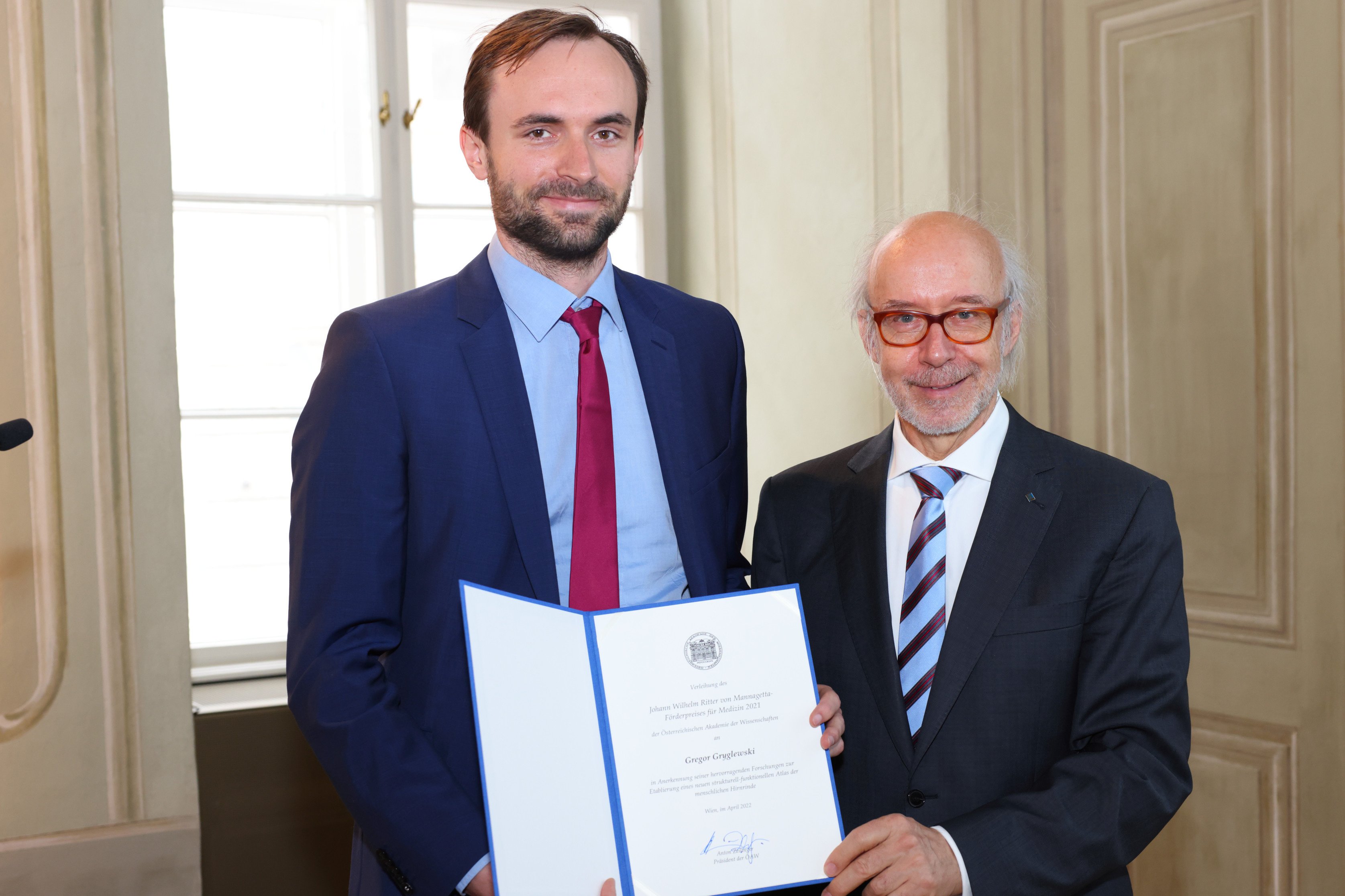 (Vienna, 28-04-2022) The Johann Wilhelm Ritter von Mannagetta Prize for Medicine is awarded once a year by the Austrian Academy of Sciences (ÖAW) for outstanding medical research by young scientists. This year, Polina Kameneva from MedUni Vienna's Center for Brain Research and Gregor Gryglewski from MedUni Vienna's Department of Psychiatry and Psychotherapy each received this award, worth €4,000.