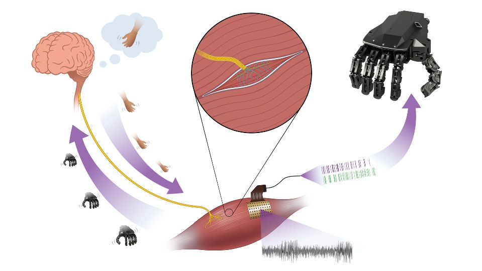 Native neuromuscular control requires feedback from the proprioceptive organs (e.g., muscle spindles) to produce coordinated movements. However, modern myoelectric prostheses are currently controlled exclusively by transmitting motor signals from a muscle. This experimental model investigated the role of proprioceptive signals in bionic control. Selective nerve transfer to a muscle was used to create a biological interface that can provide both motor and proprioceptive signals from a muscle to the bionic hand. This neuromuscular system provides a closed feedback loop for intuitive prosthetic control.