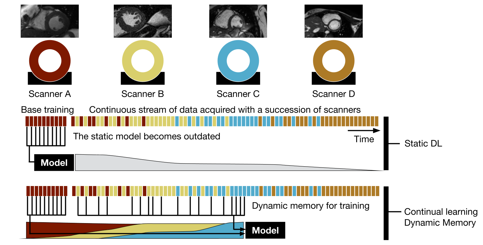 If left static, machine learning models fall out of date as imaging technology advances. Continual learning adapts the learning to an expanding diversity of scanners.