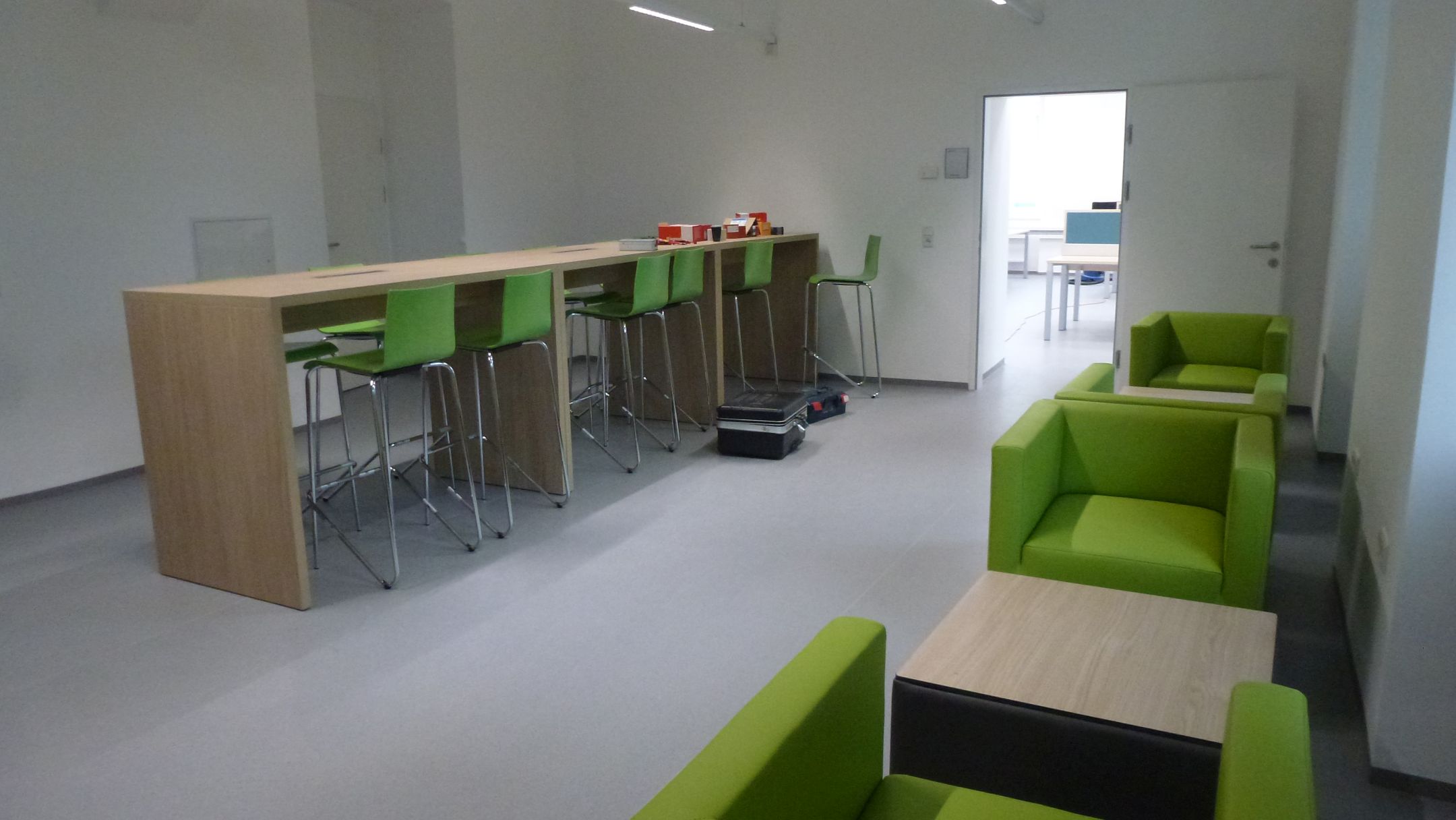 -    Kommunikationsbereich: 3 Hochtische mit eingebautem Med-Uni-LAN-Netzwerkanschluss und mehreren Stromsteckdosen, bzw. USB-Anschlüssen; Sitzgelegenheit bitten 12 Barhocker. Zur entspannenden Kommunikation dienen zwei Couchtische mit 4 bequemen Fauteuils.