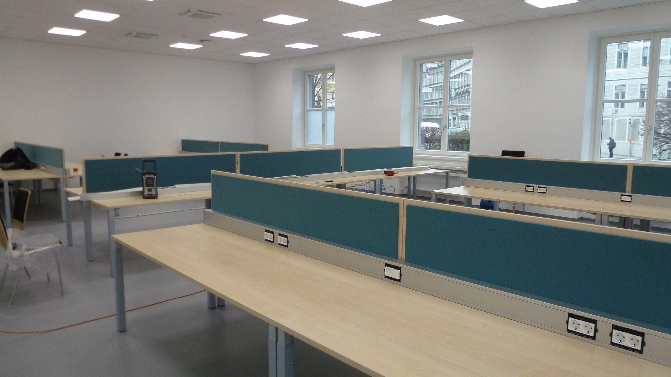 -    Bereich für konzentriertes Lernen: 22 Tische mit 44 Lernplätzen voneinander durch halbhohe Trennwände abgegrenzt. Jede Tischreihe verfügt über einen Med Uni-LAN-Netzwerkanschluss und mehrere Stromsteckdosen.