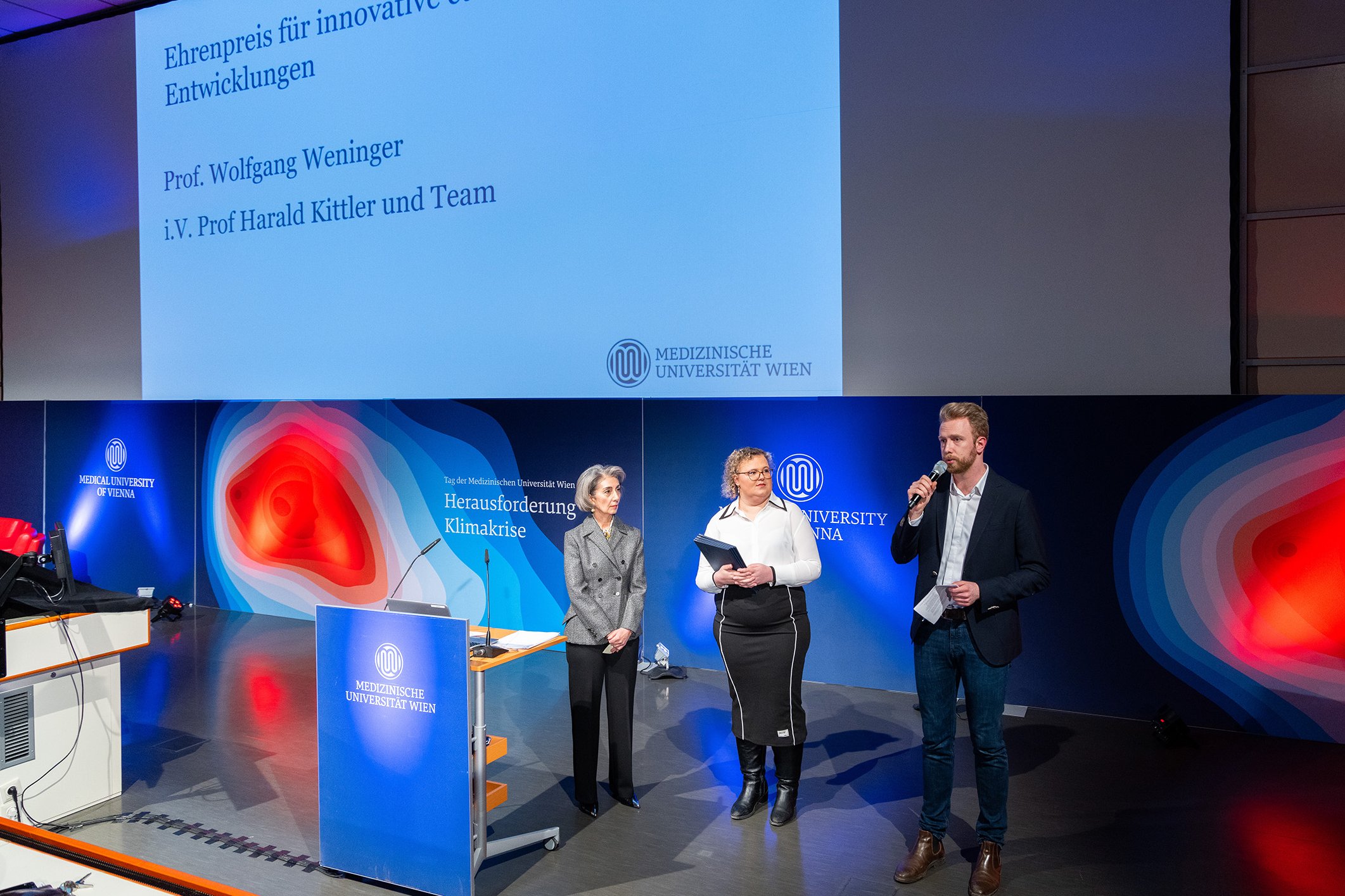 (Wien, 14-03-2022) Die MedUni Wien hat Ehrenpreise für innovative curriculare Entwicklung sowie für exzellente Lehre an Lehrende der Universität verliehen. Ausgezeichnet wurden Harald Kittler für ein Beispiel an gelungener Online-Lehre in einem interaktiven Setting sowie Heimo Lagler, Lorenz Schubert und Manuel Kussmann für ein interaktives Seminar auf dem Gebiet der antimikrobiellen Therapie. Die Auszeichnungen wurden den Lehrenden im Rahmen des Tages der Medizinischen Universität Wien übergeben.