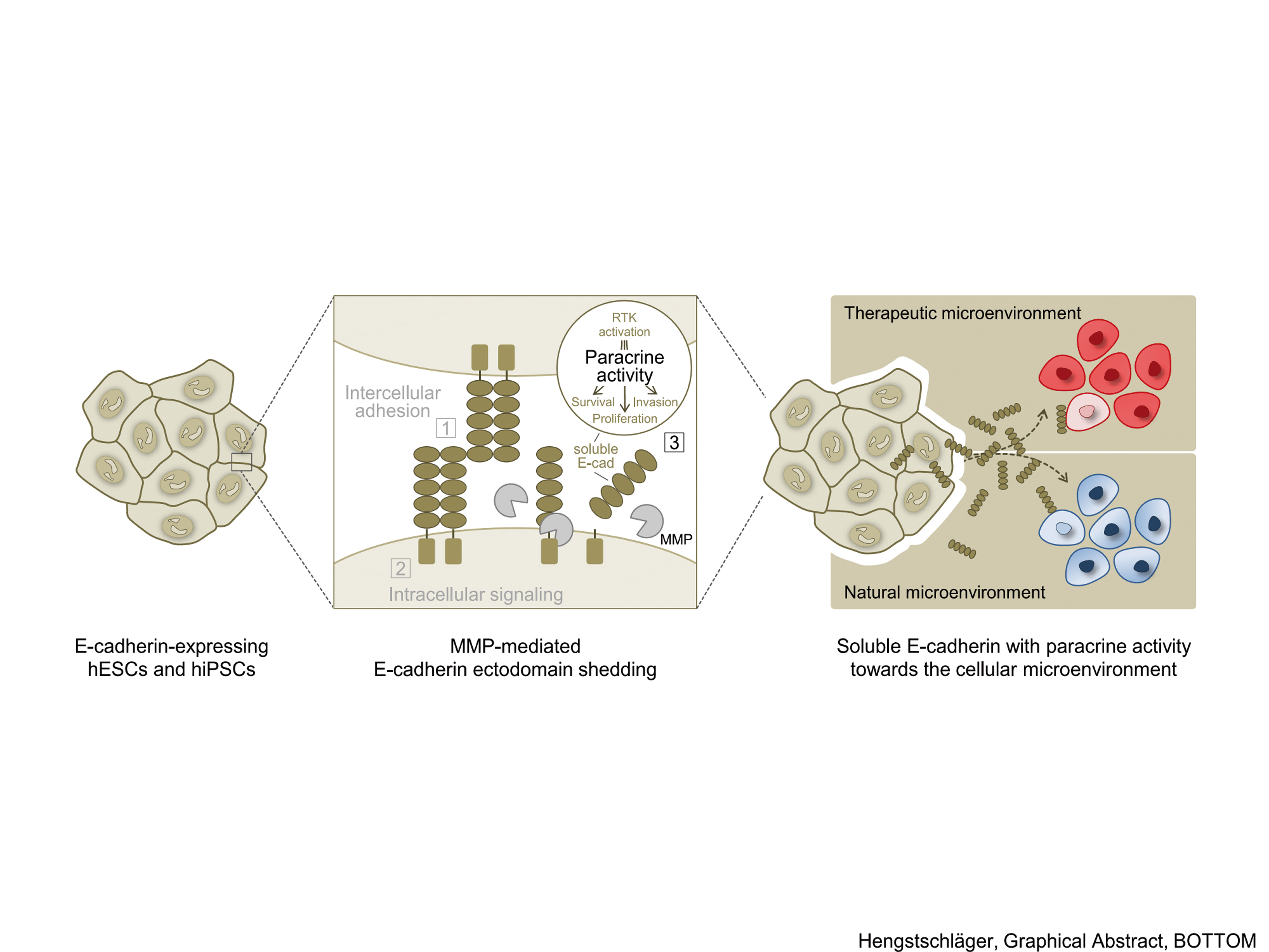 In einer jetzt im Topjournal „Stem Cells“ (eines der beiden international höchst zitierten Stammzellforschungs-Journale der Welt) veröffentlichten Studie bietet die Arbeitsgruppe von Markus Hengstschläger weltweit nun erstmals eine mögliche Erklärung für diese Phänomene: „Humane pluripotente Stammzellen senden ein Protein mit dem Namen ‚soluble E-cadherin‘ aus, das bei jenen Zellen, bei denen dieses Protein ankommt, Entartung, Wanderung im Körper und Tumorentstehung auslösen kann. Man weiß also jetzt, dass Stammzellen, die in der Therapie eingesetzt werden, Signale an normale Körperzellen der Patienten schicken, die sehr ernste gesundheitliche Risiken zur Folge haben können.“