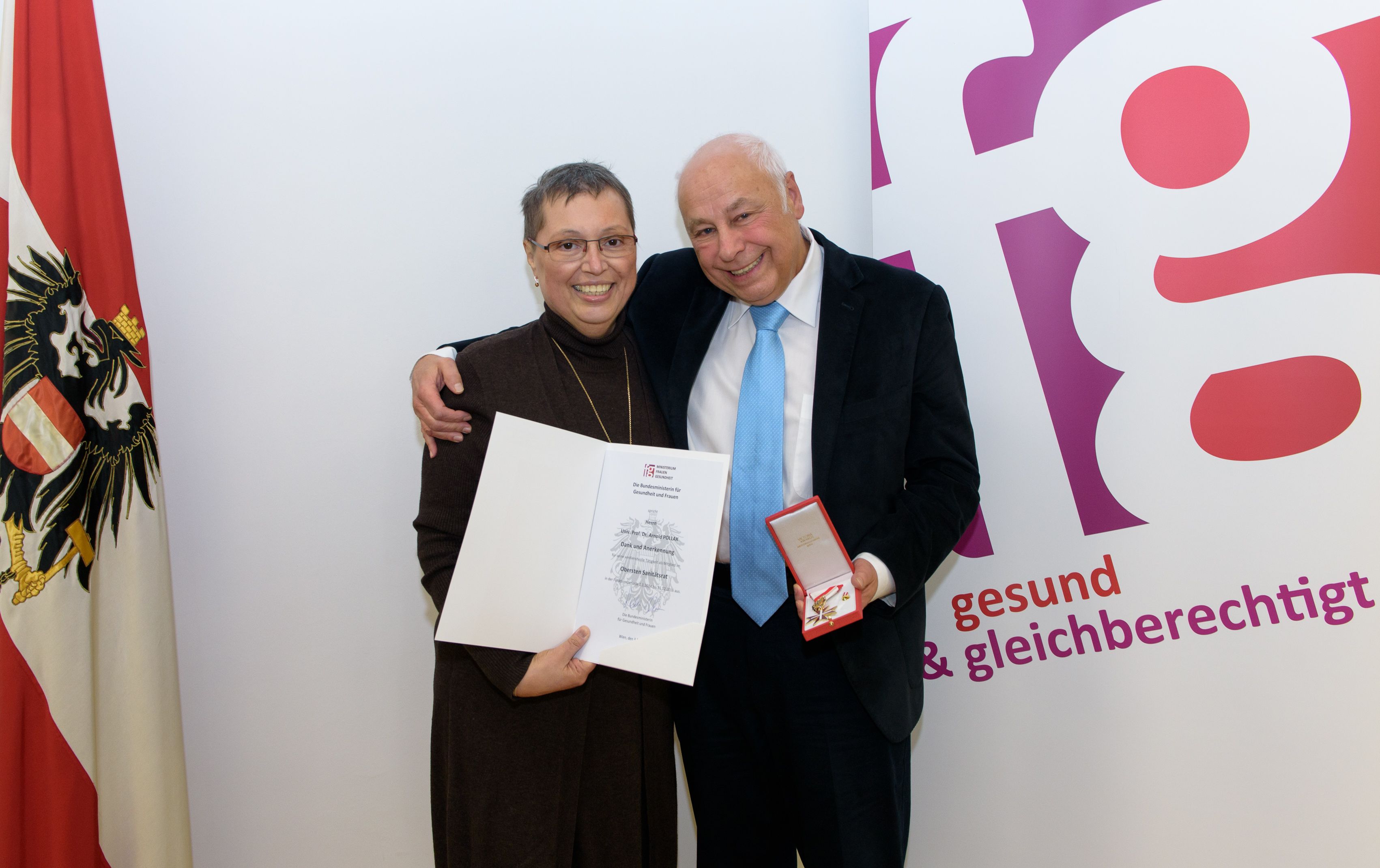 Die Auszeichnung wurde Arnold Pollak von Gesundheitsministerin Sabine Oberhauser bei der abschließenden Sitzung des Obersten Sanitätsrates im Gesundheitsministerium überreicht. Die Funktionsperiode des Obersten Sanitätsrates endet mit 31. Dezember 2016.