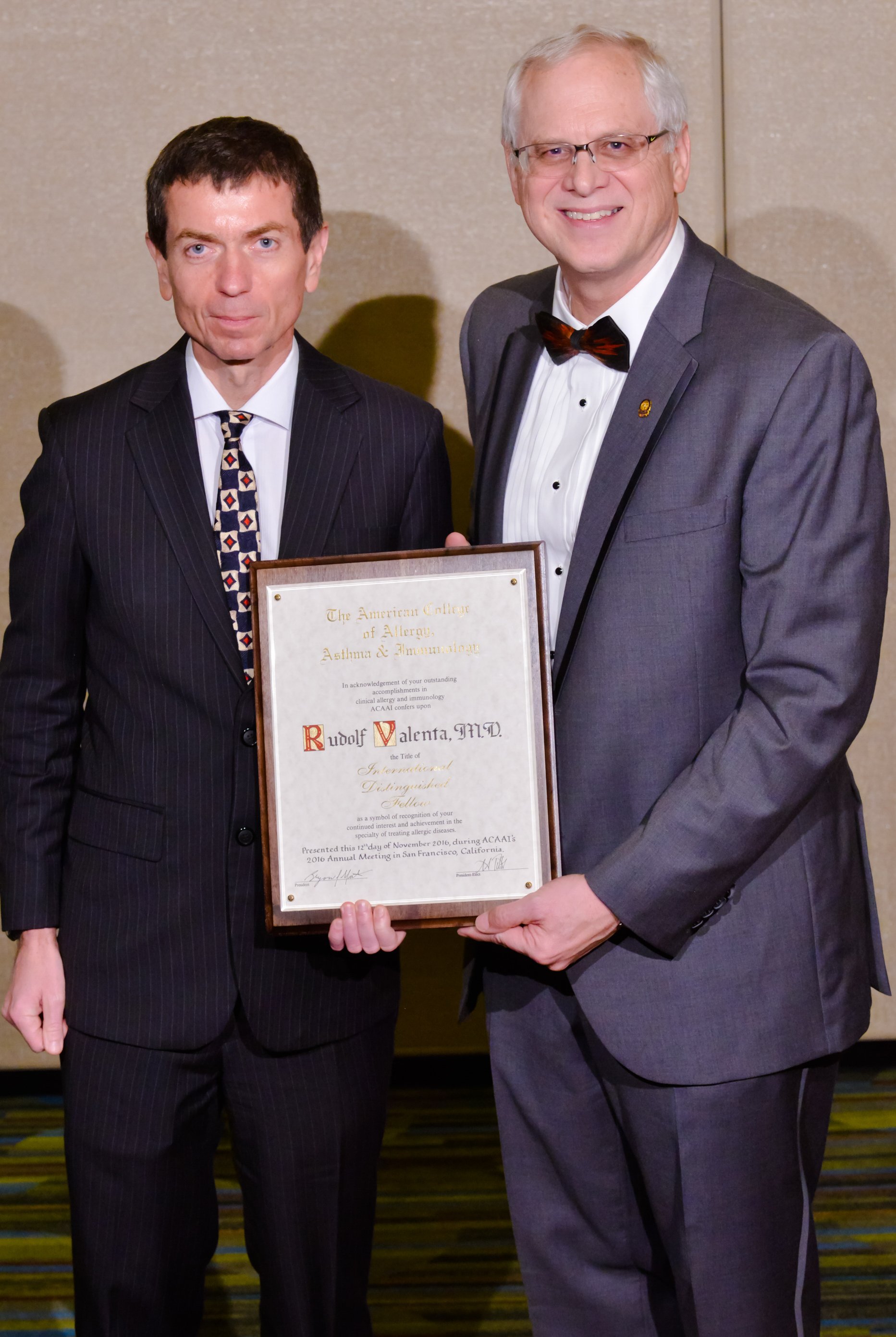 Die Auszeichnung wurde Rudolf Valenta im Rahmen der Jahreskonferenz des ACAAI in San Francisco in Anerkennung seiner Beiträge auf dem Gebiet der Allergieforschung verliehen.