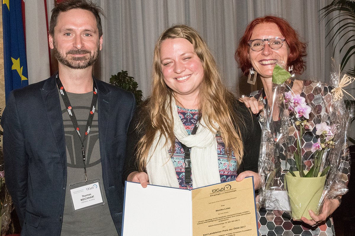 Monika Linke vom Institut für Medizinische Genetik wurde mit dem Karl Landsteiner Preis für hervorragende Arbeiten auf dem Gebiet der immunologischen Grundlagenforschung für ihre Arbeit „Chronic signaling via the metabolic checkpoint kinase mTORC1 induces macrophage granuloma formation and marks sarcoidosis progression“ ausgezeichnet, die in Nature Immunology (16 January 2017; doi:10.1038/ni.3655) veröffentlicht worden ist.