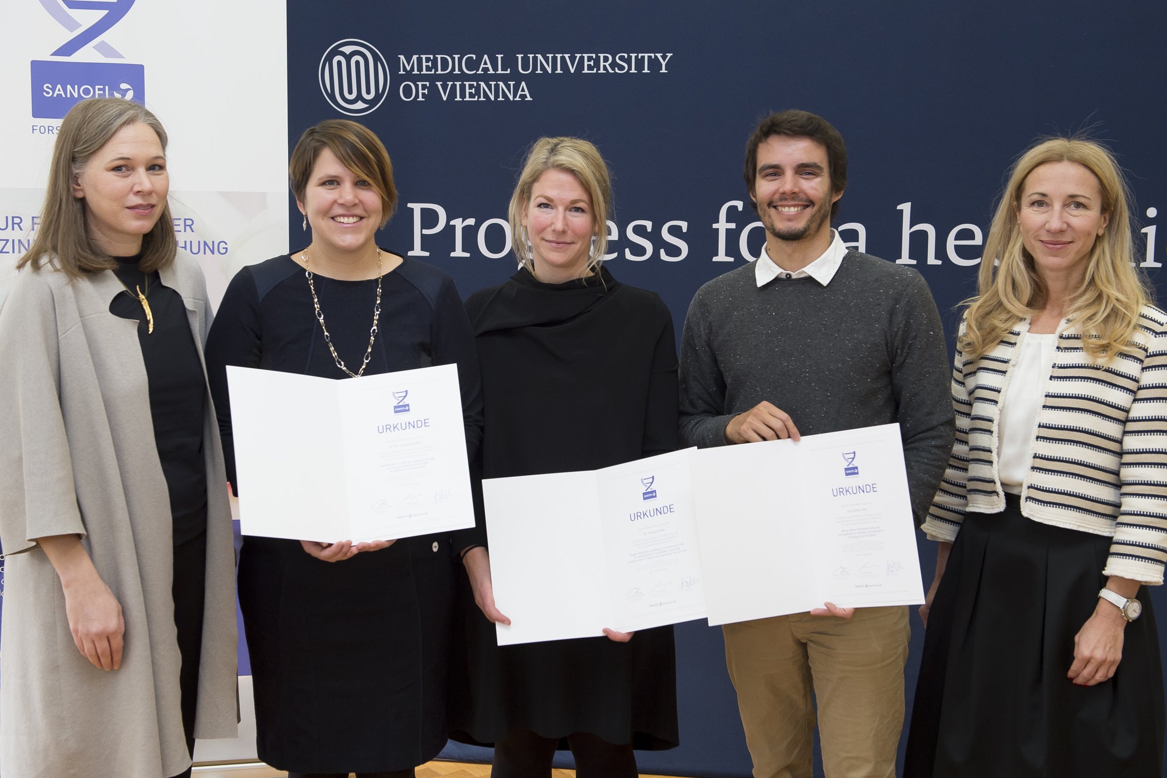(Wien, 20-11-2017) Im Rahmen eines Festaktes wurden heute im Rektoratssaal der MedUni Wien die diesjährigen "Sanofi Preise zur Förderung der medizinischen Forschung in Österreich" an insgesamt 12 ForscherInnen verliehen. Drei der Auszeichnungen gingen an ForscherInnen der MedUni Wien: Barbara Peter, Rui Martins und Katharina Blatt.