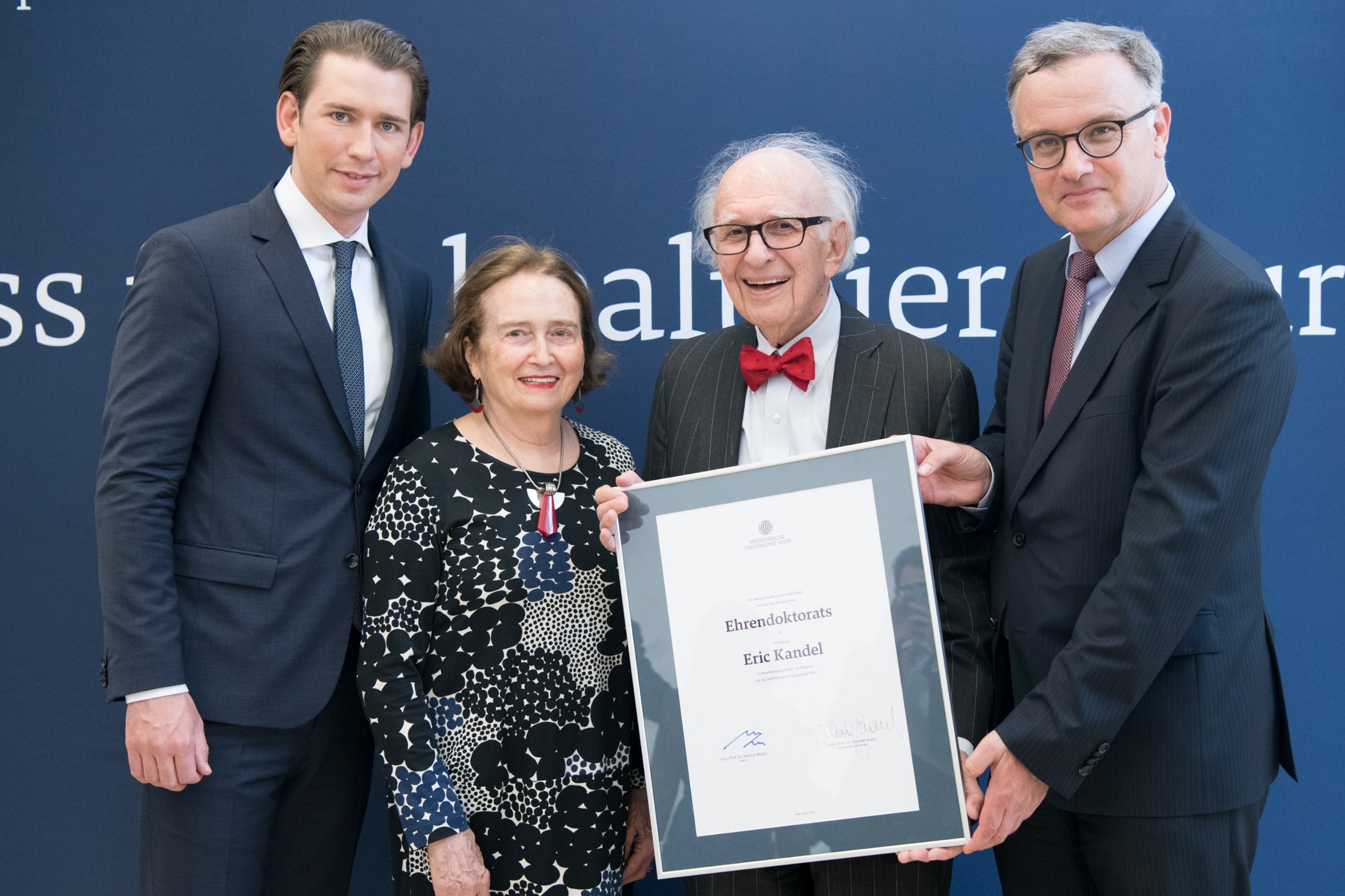 „Eric Kandel ist einer der ganz wenigen lebenden Nobelpreisträger mit Wurzeln in Österreich. Damit allein ein großes Vorbild von uns allen. Wir haben eine Verantwortung gegenüber jenen, die vertrieben wurden und die keiner mehr zurückgeholt hat. Eric Kandel verkörpert als Mahner der Republik den Blick zurück und als erfolgreicher Wissenschaftler und Vorbild den Blick nach vorne“, sagte Bundeskanzler Sebastian Kurz.