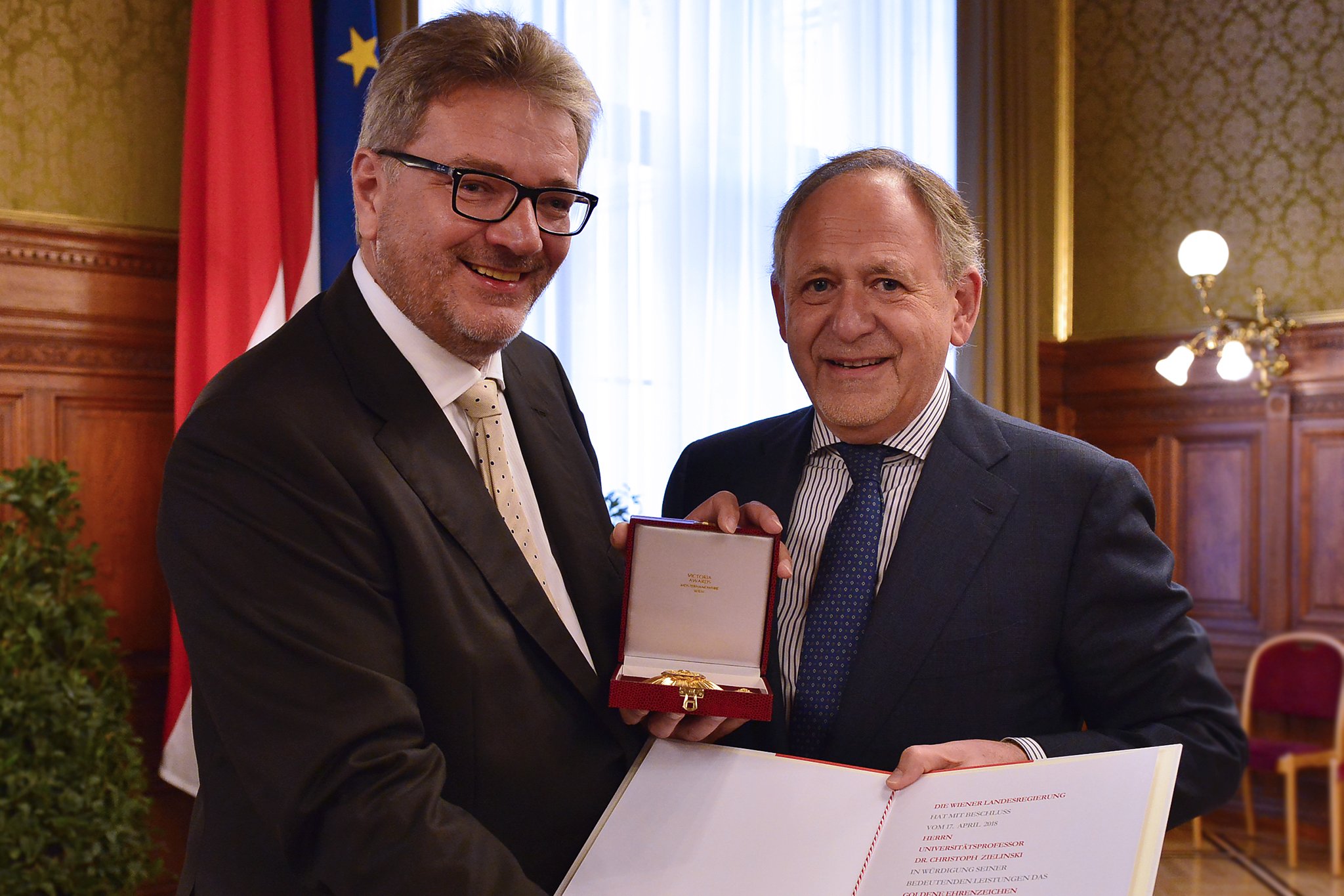 (Wien, 21-09-2018) Das Land Wien überreichte heute das Goldene Ehrenzeichen für Verdienste um das Land Wien an Christoph Zielinski, Leiter des Comprehensive Cancer Center der MedUni Wien und des AKH Wien. Die Auszeichnung würdigt das Wirken des Onkologen im Gesundheitsbereich, das auch über die Landesgrenzen hinweg reicht. Die Ehrung, an der zahlreiche Persönlichkeiten aus dem Gesundheitssektor und der Politik teilnahmen, erfolgte durch den Stadtrat für Gesundheit, Soziales und Sport, Peter Hacker.
