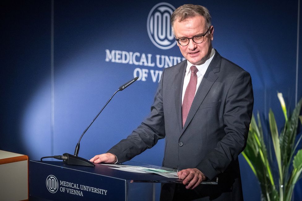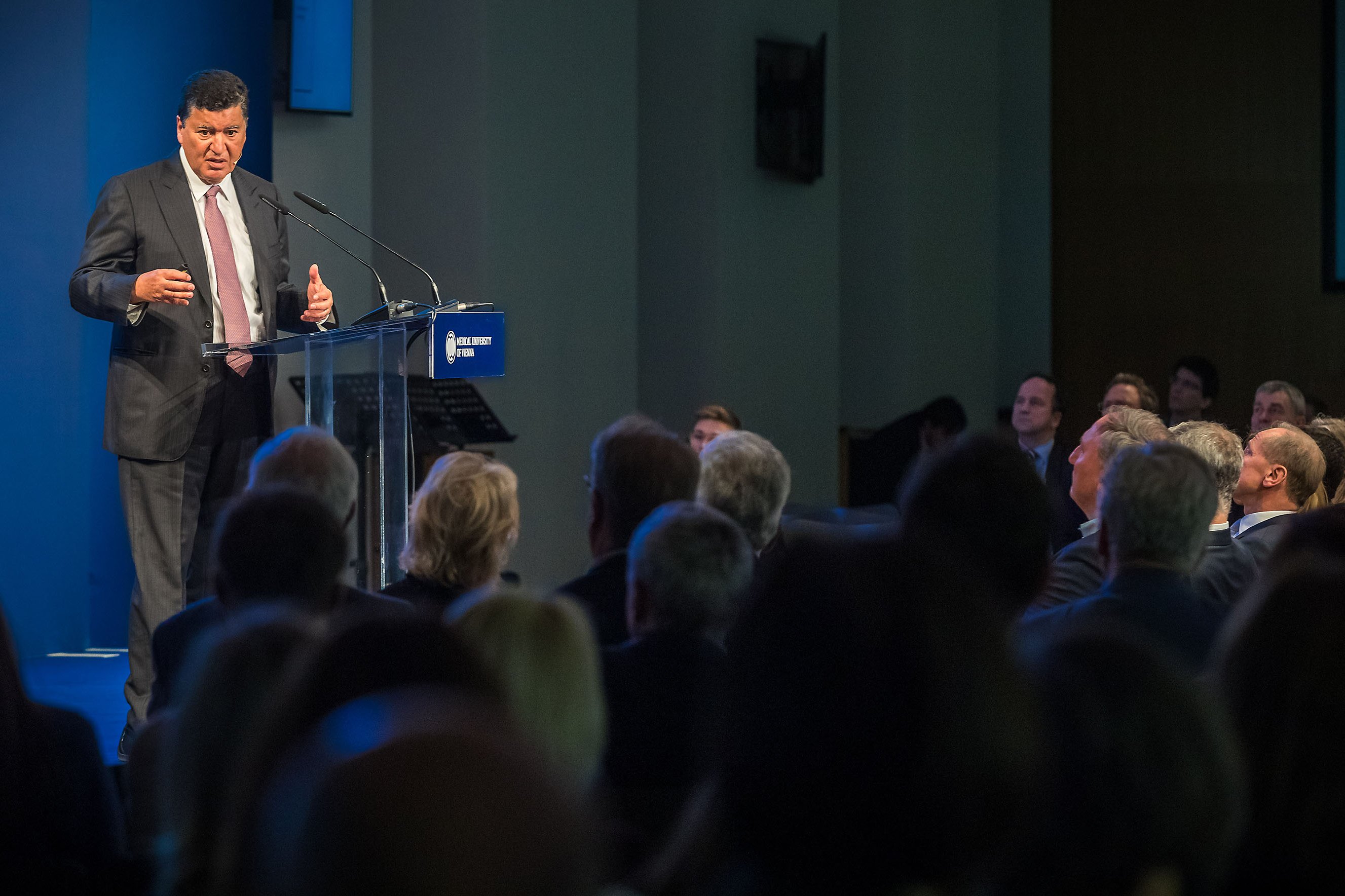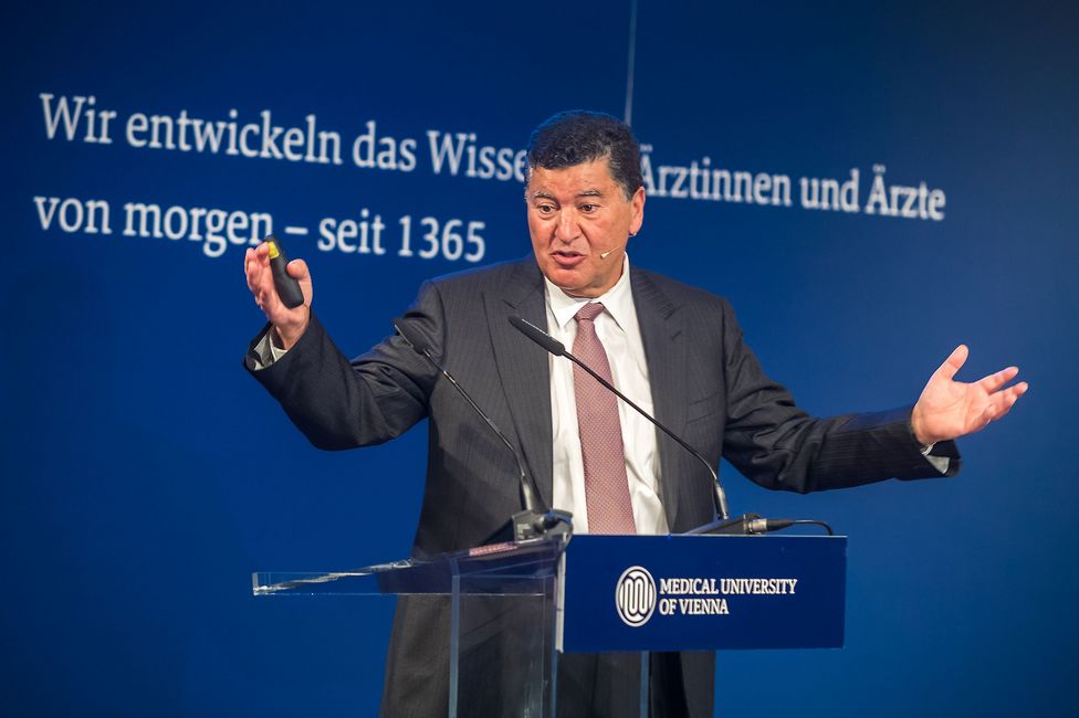 Den Festvortrag bei der abendlichen Festveranstaltung im Van Swieten Saal hielt Elias Zerhouni, Radiologe, langjähriger Leiter der National Institutes of Health (NIH) – der wichtigsten Behörde für medizinische Forschung in den USA – und Berater mehrerer US-Präsidenten. Zerhouni, weltbekannter Wissenschafter und auch schon auf dem Cover des bekannten Time-Magazines verewigt, sprach zum Thema „Academia, Government and Industry in Biomedicine – Emerging Trends“ und zeigte dabei auf, in welchen Bereichen Österreich in der Wissenschafts-Community stark ist – und wo es noch Aufholbedarf gibt. Im Rahmen des Abends wurde auch der neue Imagefilm der MedUni Wien präsentiert.