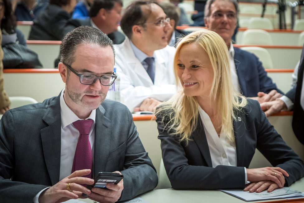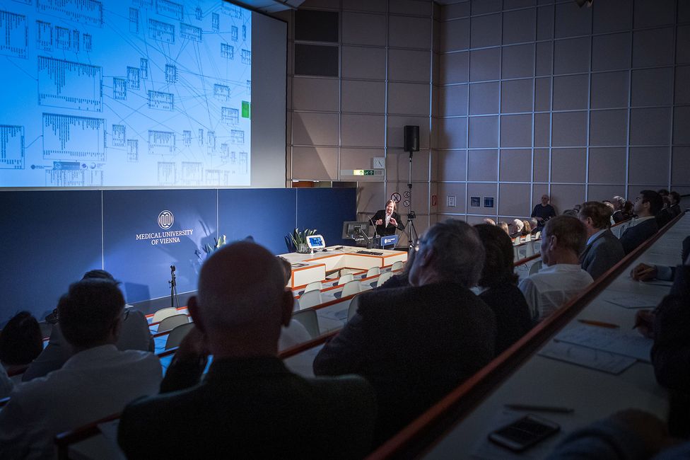 Der Tag begann mit einem Frühstück für neue MitarbeiterInnen, danach folgte die Universitätsvorlesung, bei der zwei Top-Experten Vorträge zum Thema Big Data und Präzisionsmedizin hielten: Komplexitätsforscher Stefan Thurner ging der Frage „Will medicine become data science?“ auf den Grund, der Thoraxchirurg Walter Klepetko trat in seiner Keynote mit seinem Publikum eine „eine akademische Reise von Wien nach Boston“ in Sachen Lungentransplantation an und wies auf die große Bedeutung von Präzisionsmedizin für die medizinische Forschung im 21. Jahrhundert hin.