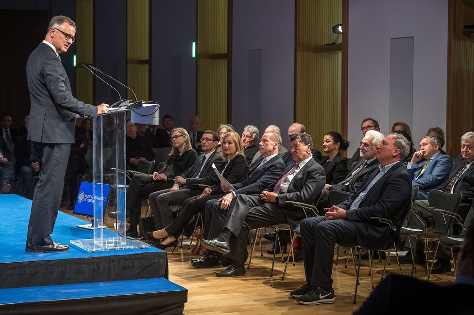 (Wien, 13-03-2019) Am 12. März 2019 beging die Medizinische Universität Wien erstmals ihren "Tag der Universität". Mit einer Reihe von Veranstaltungen – einem Festakt, der Universitätsvorlesung, Diskussionsrunden, Vorträgen, akademischen Feiern und Ehrungen und einer Party am späten Abend wurde dieser Tag für alle MitarbeiterInnen, Studierende, Alumni/ae und Freunde der MedUni Wien zu einem großen Erfolg und soll zu einem jährlichen Fixpunkt werden. Einer der Höhepunkte war neben einem mitreißenden Festvortrag des weltbekannten Radiologen und Biomediziningenieurs Elias Zerhouni auch die Präsentation des neuen Imagefilms der MedUni Wien.